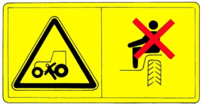 Meaning: Please keep the safe distance with the tractor, to avoid the personal injuries! Post position: left from the rear side of mudguard